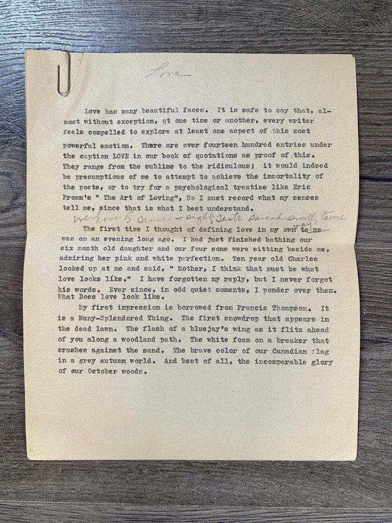 We have five senses – sight, taste, sound, smell, touch. The first time I thought of defining Love in my own way was on an evening long ago. I had just finished bathing our six month old daughter and our four sons were sitting beside me, admiring her pink and white perfection. Ten year old Charles looked at me and said, “Mother, I think that must be what Love looks like.” I have forgotten my reply, but I never forgot his words. Ever since, in odd quiet moments, I ponder over them. What does Love look like?
